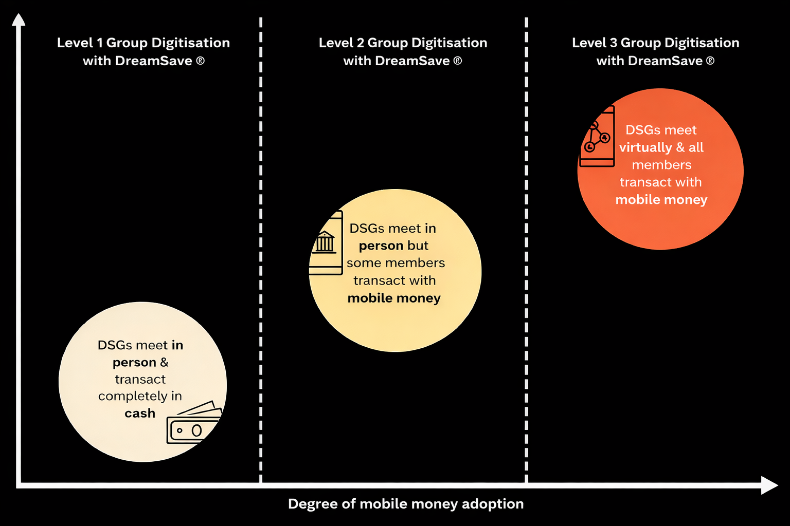 Understanding which category your groups fall into is key to understanding how DreamSave can be used to satisfy their digital payment needs. To help NGO partners leverage DreamSave in addition to MM, this note will focus only on Level 2 and Level 3 DSGs.